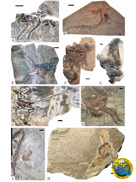 A. Tianyulong; B. Sinosauropteryx; C, D. Beipiaosaurus; E. Dilong; F. Sinornithosaurus;