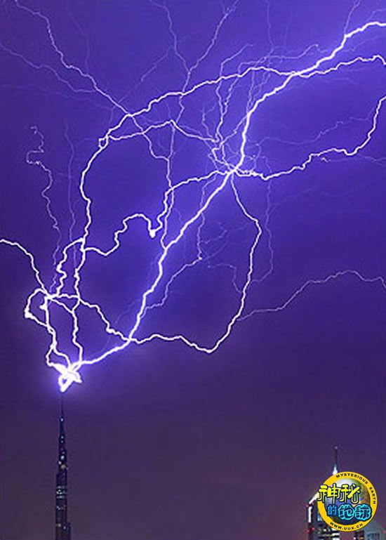 上面这张令人震惊的照片展示了世界最高建筑哈利法塔遭闪电击中时的场面。