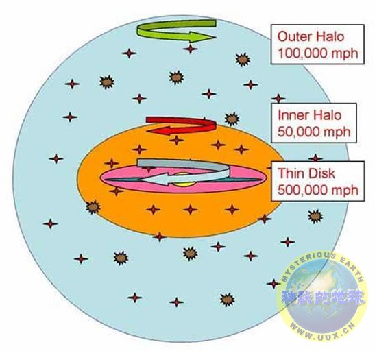 银河的主要圆盘里有我们的太阳,它平均以每小时50万英里的速度旋转。这个圆盘的周围是现在我们所说的内晕。它与圆盘的运行方向一样,速度是每小时5万英里。外部比较稀薄的区域是银河外晕,它与这个圆盘的运行方向相反,速度是每小时10万英里。这两个部分还存在化学差异。内晕中的恒星所含的重原子是外晕中的3倍,其中包括铁和钙。这些重元素是在庞大的恒星爆炸,然后生成下一代恒星的过程中产生的。