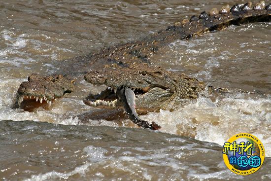 其实,很多肉食性鳄鱼并不凶残。在现生的20多种鳄鱼当中,只有两种是吃人不眨眼的“食人鳄”。一种是鳄鱼中的“巨人”--现生鳄鱼中惟一能在海中生活的湾鳄,它的体长一般有6~7米,最大的据说有10米;另外一种是产于非洲的尼罗鳄。大多数鳄鱼通常不会主动进攻人类,尤其是产于我国长江中下游,也是惟一生存于温带的现生鳄鱼--扬子鳄,性情非常温和。