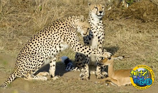 这只小羚羊很幸运,似乎那三只非洲猎豹并不饿。这是因为与其他大型猫科动物不同,非洲猎豹是在白天捕猎,要么在清晨,要么在日暮时分。捕猎需要的急速爆发力会让它们疲惫不堪,这意味着捕猎之后它们需要休息。这似乎就是这只不知天高地厚的羚羊在遭遇非洲猎豹后还能幸存下来的秘密,可能它落入了非洲猎豹群,而这些非洲猎豹清晨已经捕食饱腹,这时候正筋疲力尽。