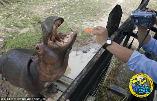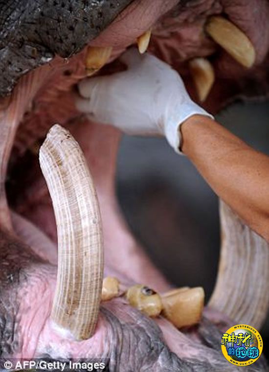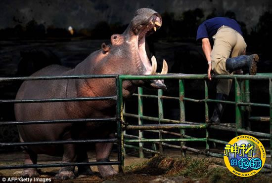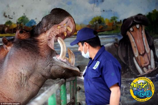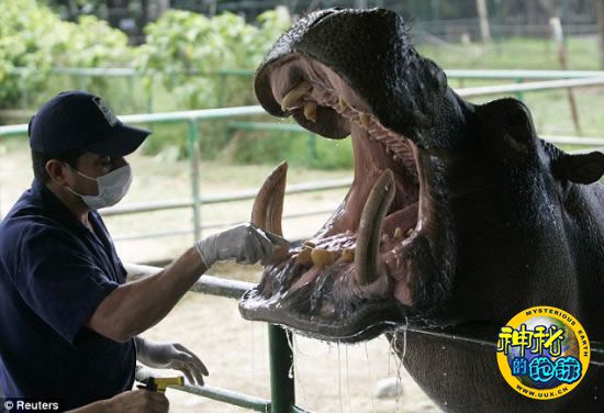 河马“Orion”,大嘴张开后宽度最高可达到4英尺(约合1.21米),牙齿最长可长到3英尺(约合0.91米),每天最多要吃掉150磅(约合68公斤)食物。对于这只河马来说,它很清楚看牙医是一件非常重要的事情。