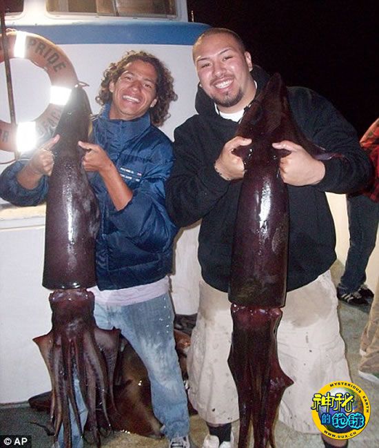 渔民塞斯·齐与弗兰克·杜纳斯正在展示他们在新港海滩捕获的巨大鱿鱼。这些鱿鱼一般都在10公斤到20公斤之间,最重的达到27公斤。到目前为止,渔民们已经捕捉到400多条大鱿鱼。