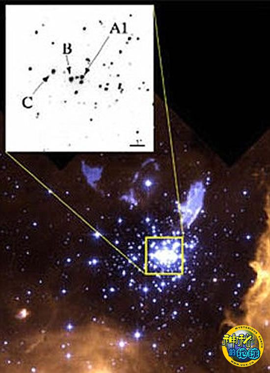 银河系NGC 3603 中人类所知的最大恒星A1位于另外两个巨大的佛耳夫 - 拉叶星旁,编号分别为B和C。