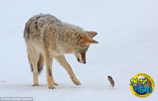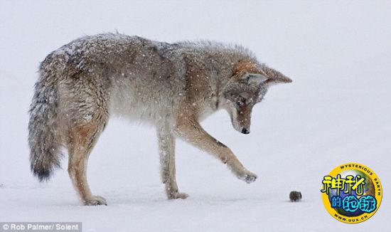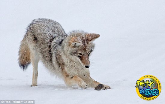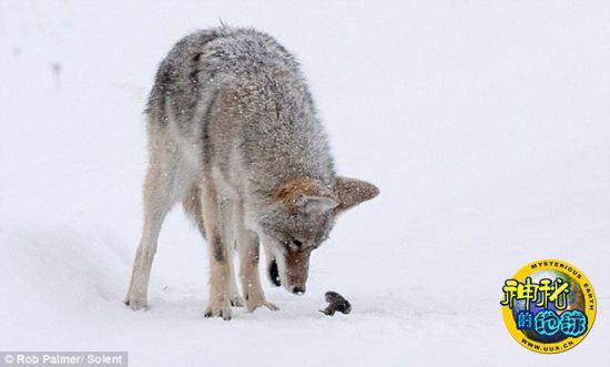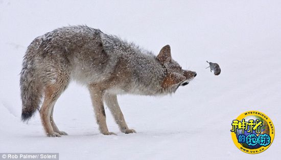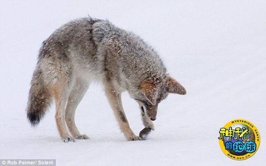 职业摄影师罗波·帕尔默用照相机拍摄下这些精彩的照片。现年56岁的帕尔默说:“这只草原狼沿着公园里积雪覆盖的路捕食野鼠。我从路上我注意到它。”“草原狼将头探进雪堆,从里边叼出一只野鼠。”