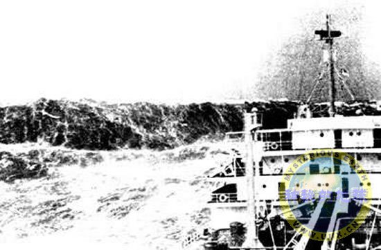 这是一幅罕见的巨浪照片,是埃索·朗格多克超大型油轮的大副菲利普·里约尔1980年南非德班附近海域发生暴风雨时拍摄的。巨浪从后面扑向船甲板,不过,造成的损害却不太大,巨浪高达5至10米。