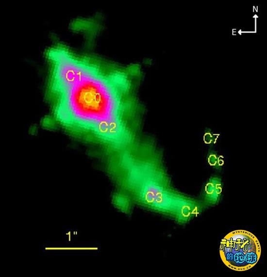 如图所示,图中绿色部分是钱德拉X射线观测台探测到的喷射流,科学家发现这种较长的喷射流在射电和X射线波长光谱范围内非常明亮,通过标记不同的喷射流簇团,图中的等级单位对应为250个天文单位。
