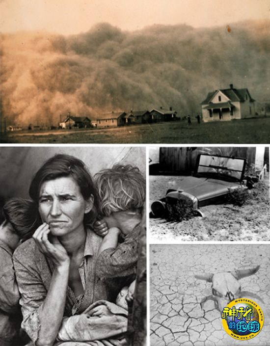 美国大平原一个异常罕见的多雨期引来了无数的定居者,他们希望能够在这里取得农业的丰收。然而,好景不长。当该地区典型气候回归之时,当地农民为了继续取得丰收,他们采取了某些非可持续性的耕作法,这加重了土壤浸蚀的程度。1934年,一场严重的旱灾侵袭该地区,地表的沙尘被大风卷起,形成了一场罕见的巨大沙尘暴。狂风卷着尘土,遮天蔽日,白天也好似黑夜一般。沙尘暴造成50万人无家可归,许多人死于沙尘引起的肺炎。到1940年,大约250万人离开大平原,前往土壤更肥沃的地区谋生。