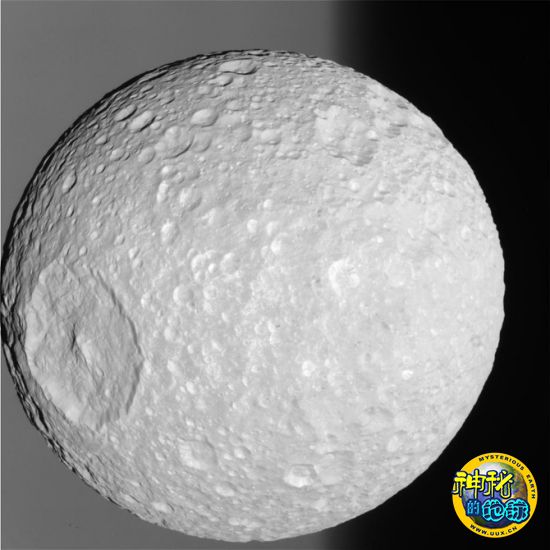这张照片是“卡西尼”飞船2月13日拍摄的,当时飞船距离土卫一43000英里(69201公里)。土星的一条光环提供了美丽的背景。