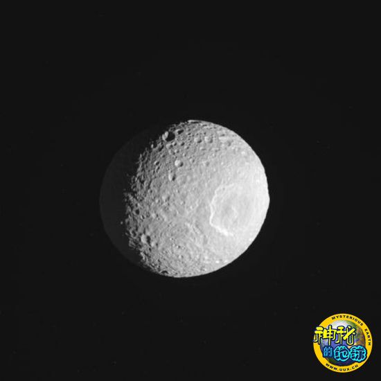 土卫一(Mimas)是土星62颗卫星中第20大的卫星,直径大约是246英里(396公里)。土卫一或许是太阳系内最小的因重力作用而呈圆球形的天体。不过由于潮汐效应的作用,土卫一并不呈完美的球形;其长轴大约比其短轴长10%。如图所示,从卡西尼号发回的最新图片上看土卫一更接近于卵形。