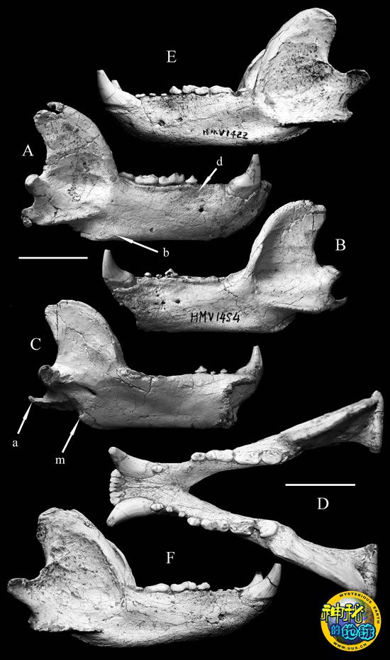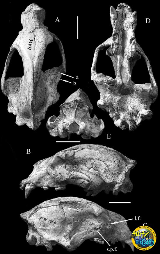 摘要:2006年作者在和政县发现了两件产自东乡龙担动物群的熊类化石:一完整下颌(HMV 1422)和一个咬合在一起的头骨及下颌(HMV 1454)。熊类系龙担哺乳动物群中未曾描述过的新成员。这两件标本虽然有少许不同,但都和李亦征(1993)所记述的沂南熊Ursus (Protarctos) yinanensis十分接近,而被归入该种。该种修订后的鉴别特征是:头骨长头型,头长接近中等大小的现生黑熊,头骨最大宽约为最大长的一半;矢状嵴长,约为顶长的1/3;眶下孔与眼眶前缘相距近,两者均在M1上方;颧骨前端仅组成眼眶下缘,其后端止于关节窝前缘水平;硬腭短,齿列之后的腭长小于P4长的1.5倍或M2长的3/4。前臼齿数目全;P4原尖小,位于裂凹正内方;M1短长方形,宽/长~80%;M2跟座中长,M2宽/长56%~58%;M2长/M1长133%~153%。m1无前下后尖及前下内尖,分隔下三角座和跟座的横沟窄(前后),横沟中没有明显的嵴和沟;m2短于m1,其前、后接近等宽。与U. boeckhi相比,P4相对更小;臼齿相对更窄长;M1不呈五边形;M2跟座更大;m1横沟短,V形。