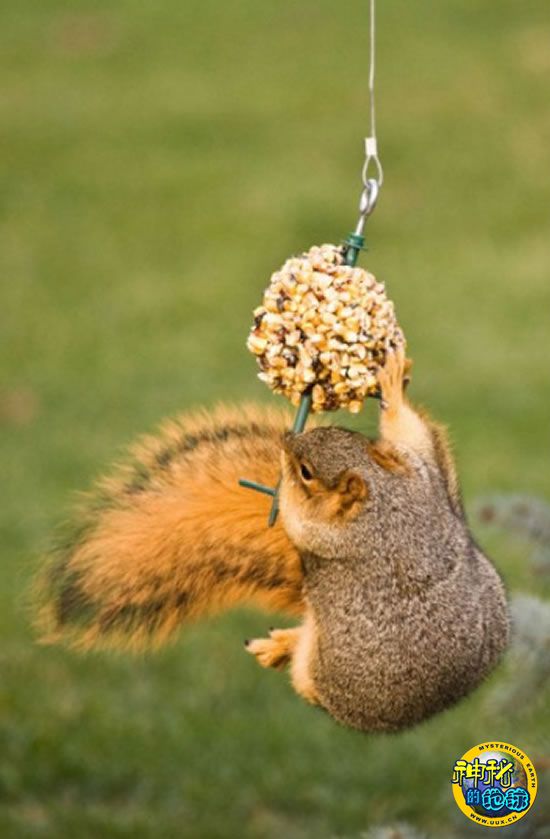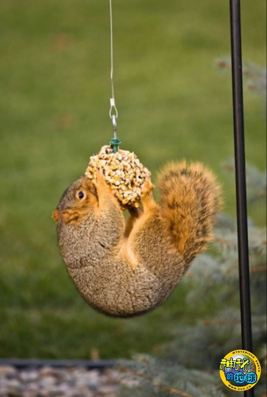 美国密歇根州的詹姆士·菲尔普斯在自家后花园设置了喂鸟器,他说:“它们在这里获得很多食物,因此它们变得很胖。它们设法爬到喂鸟器上,呆在上面吃东西,这种场面非常有趣。这只松鼠正在设法爬上喂鸟器,但是由于没抓紧金属丝,它从上面重重地跌落下来。然而它们的决心很大,不会被这种小挫折吓倒。”