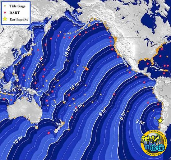 2010年2月27日,美国政府官方地图显示,有可能形成的太平洋海啸将于当日晚些时候来袭。