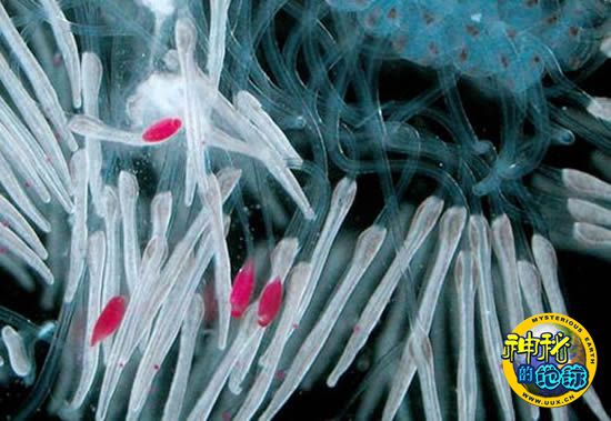 最近,蒙特雷湾水族馆研究所的研究人员发现了一种深海管水母。这种深海管水母是水母的一种近亲,它们会产生红光诱捕猎物。这一新发现的物种尚未命名。与其他的管水母一样,新物种也是一种超个体。这种所谓的超个体由许多高度专业化的结构发育而成,这些结构也被称为游动孢子。每一个游动孢子完成不同的功能,比如摄取食物和繁殖等。这种深海管水母负责摄取食物的游动孢子采用发自触角尖端的独特红光引诱猎物上当。某些鱼类面对这种红光诱饵可能会上当,这种散发红光的触角尖端看起来就像是一个肥美的甲壳类动物。触角尖端包含有一个发光器官,这种器官主要负责产生红光。蒙特雷湾水族馆研究所科学家史蒂夫-哈多克认为,这种诱饵适用于深海捕食,因为那里的食物稀缺,鱼类更少。