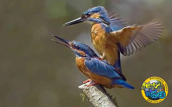 翠鸟是一种羽毛鲜艳、非常美丽的小鸟,但也十分罕见。由于翠鸟的速度惊人、动作灵巧,拍摄到翠鸟的照片需要运气。不过英国一位摄影师却非常幸运地捕捉到翠鸟交配的照片。