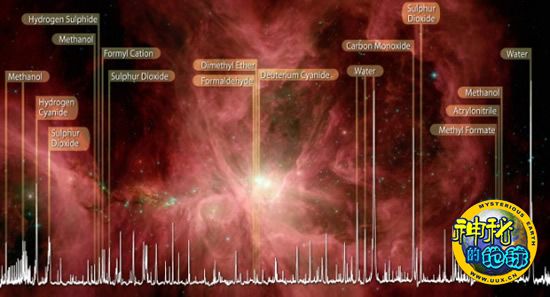 据天文学家介绍,通过分析射入光线光谱的细微差别,他们能够检测出水和甲醇等分子的化学迹象。天文学家们根据分析结果绘制了一幅光谱分析图,图中曲线上的各尖峰分别代表了相应化学分子的存在。