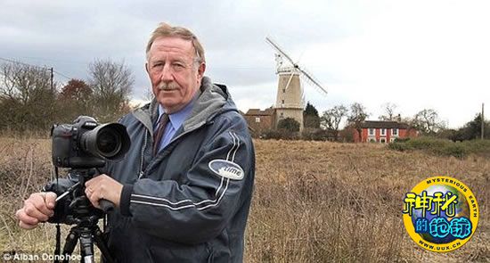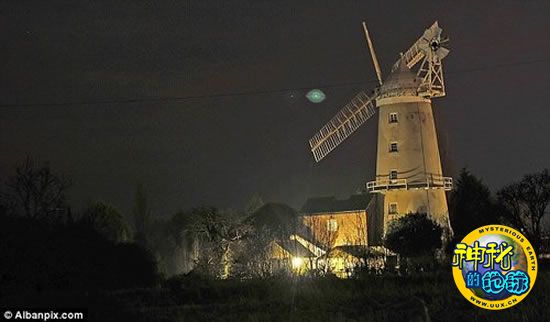 摄影师彼得-拉伊(Peter Rye)本来计划在夜晚拍摄磨坊风车的夜景,却无意之中拍摄到离奇的发着绿光的UFO飞碟。据悉,磨坊风车是诺福克市一处标志性建筑,始建于1835年,夜晚拉伊将照相机放置在三角架上,通过长期曝光来拍摄风车夜景。