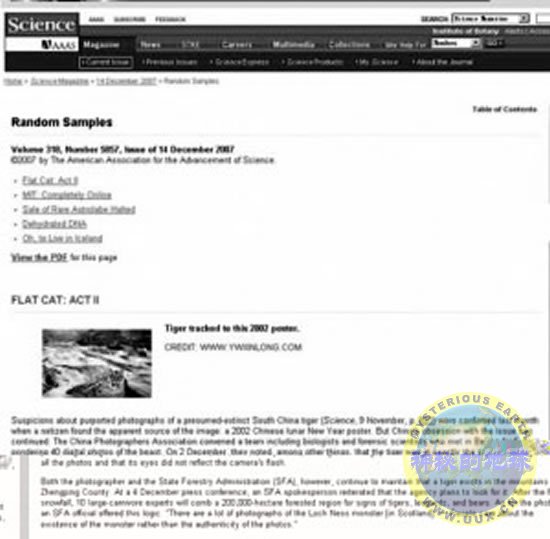 11月9日,《科学》杂志刊登了“华南虎”报道,图说为“Flat cat?”(平面猫科动物?)