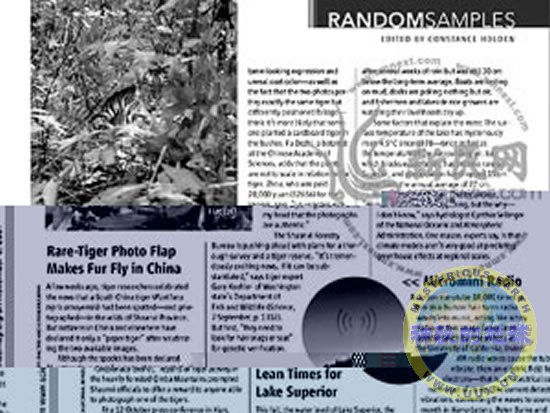 华南虎照事件又有新进展,世界权威科学杂志《科学》在11月9日正式刊出极具争议的周正龙拍到的华南虎照片之后,12月14日《科学》杂志“Randomsamples”(随机样本)栏目中报道了华南虎照风波的新闻稿题为《老虎照源于2002年年画》。