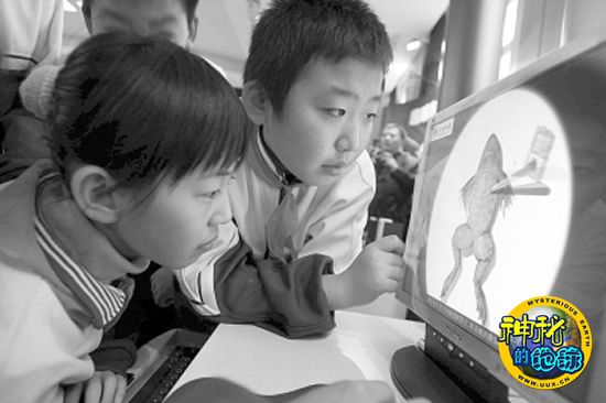 北京朝阳区潘家园街道的孩子们成为首都数字科普互动大课堂活动的首批参观者,他们正在用电脑进行青蛙解剖实验。CFP/图