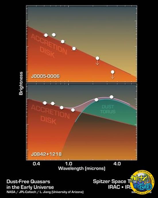 斯皮策的数据表明,在21个类星体中, J0005-0006 类星体和J0303-0019类星体上没有尘埃。樊说:“我们认为这两个黑洞形成的时间大致在宇宙大爆炸后的10亿年之内,这是宇宙中尘埃刚刚形成时期。”