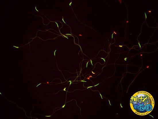 荧光染色精子的微观图片:绿色表示存活的精子,红色表示已经死亡的精子