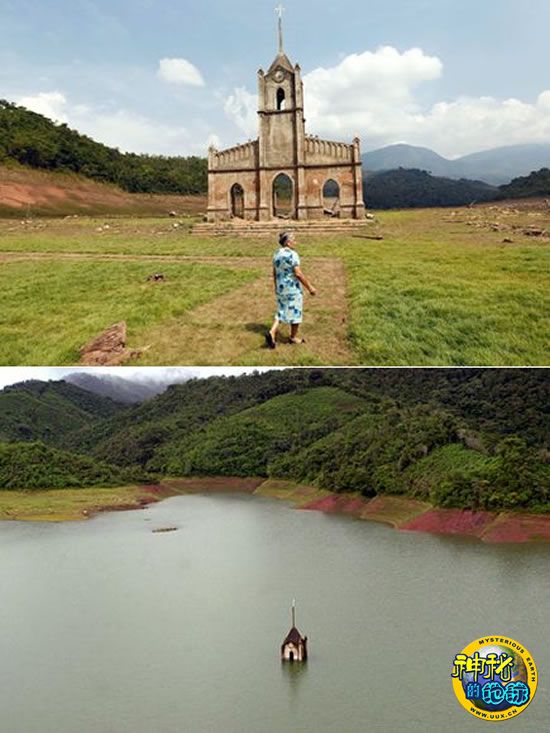 你或许称之为无法抗拒的天意:委内瑞拉境内严重的干旱使得这座82英尺(约合25米)高的教堂矗立于荒原,而就在之前的一年,这座教堂还淹没于一片泽国之中,为一座建于1985年的水力发电站汇集水源。上图摄于2010年2月,下图摄于2009年1月。据路透社报道,因干旱造成的水资源短缺,这个水力发电站当前只能以相当于设计能力7%的发电量运行。图中的教堂现已成为委内瑞拉能源短缺的一个不祥的象征,该国68%左右的发电量都来自于水力发电。干旱甚至迫使委内瑞拉总统查韦斯在2010年2月宣布国家进入能源紧急状态,以应对严重的能源短缺。