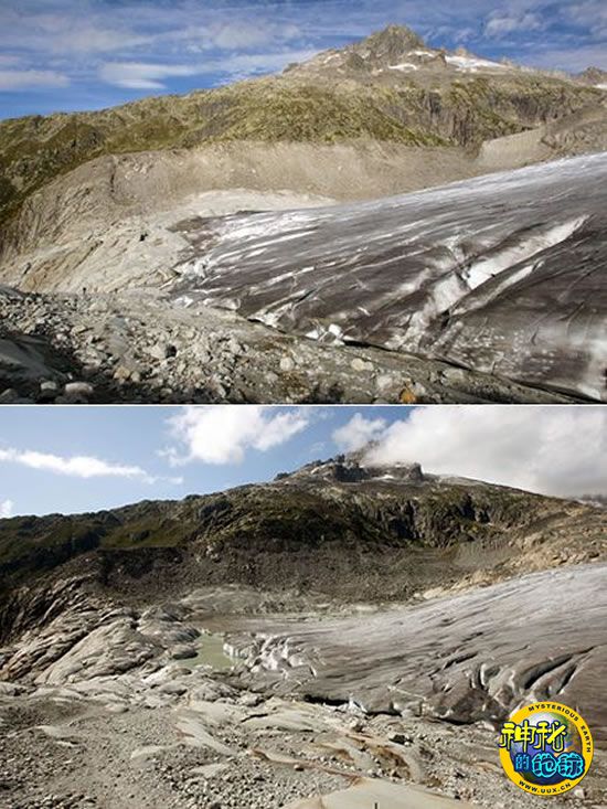随着全球气候变暖,即便是瑞士的冰川都有可能无法经受住时间的考验。由于本地区温度不断上升,位于瑞士阿尔卑斯山脉的隆河冰川(Rhone glacier)面积正迅速减少,上面两张照片分别摄于2004年9月(上图)和2008年8月(下图),冰川消褪留下的痕迹清晰可见。英国气象局下属气候研究中心——哈德莱中心(Hadley Centre)称,气象专家预测,到2040年,热浪将席卷欧洲许多国家,对淡水资源产生严重影响。