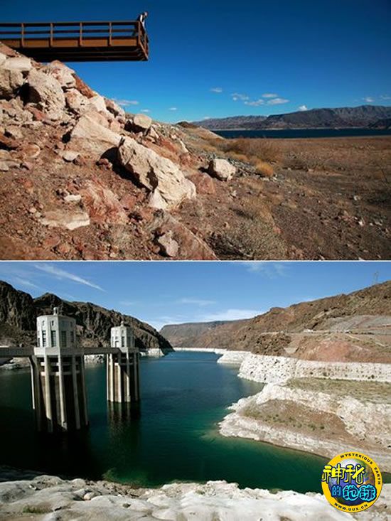 上图,一男子站在码头一端远望,这个码头过去曾连着美国第一大人工水库——米德湖。这张照片是由美国摄影师乔纳森-瓦特曼(Jonathan Waterman)摄于2008年。下图则是米德湖在2006年的景象,摄于胡佛水坝附近。据瓦特曼介绍,米德湖是科罗拉多河沿岸一个用于水力发电的水库,原本作为“水银行”之一,为干旱的美国西南部的3000万居民提供淡水。