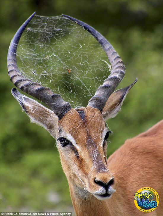 据《每日邮报》报道,这是自然界里最奇特的“一对”:一只黑斑羚的两只角竟然成了一只蜘蛛舒适的家。很显然,这只小羚羊在国家公园里闲逛时,无意中两角挂住了蛛网,之后,这只蜘蛛就一直悠闲地生活在它的脑袋上。