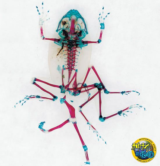 布兰登使用染料将这只青蛙软骨变成蓝色,骨骼变成红色,肌肉呈半透明。然后他使用高分辨率扫描仪对经过处理的青蛙进行扫描,得到了这张怪异的图片