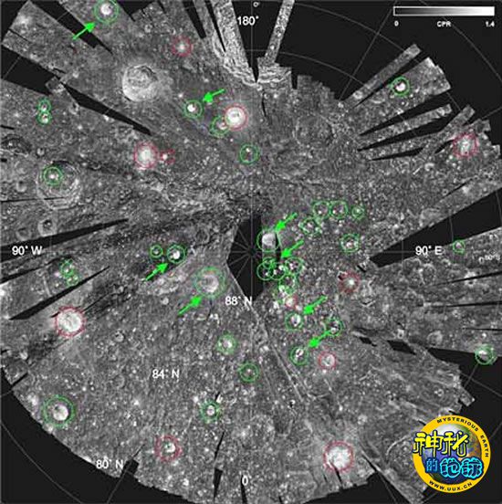 宇航局的Mini-SAR搭乘印度的“月船1号”飞船进入太空,共发现40个含有水冰的小陨坑。这些陨坑的直径从1英里到9英里(约合2)不等。水冰总量取决于每一个陨坑内的水冰厚度,据估计,这些陨坑内的水冰总量至少达到6亿公吨。图片中的红圈为新形成的陨坑,绿圈则为不规则的陨坑。