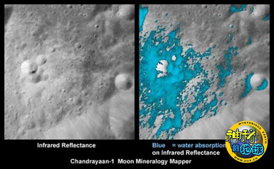 直到最近,月球仍被视为一个绝对干燥的世界。但2009年印度“月船1号”月球探测器的迷你合成孔径雷达(以下简称Mini-SAR)和月球矿物质绘图仪(以下简称M3)的测量数据,以及美国宇航局最近执行的月球陨坑观测与传感卫星(以下简称LCROSS)任务最终用事实推翻了这种论断。 Mini-SAR发现了40个陨坑,每一个陨坑都含有至少6.6英尺(约合2米)深的水冰,所有这些月球水冰的重量总计达到6亿吨。LCROSS于 2009年10月9日撞击月球,在另一个陨坑内发现月球水存在证据。
