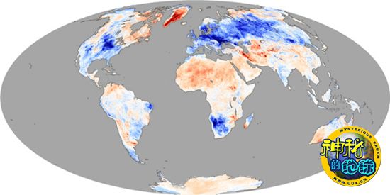 美国宇航局“Terra”卫星上的中分辨率成像光谱仪根据观测数据分别绘制了2009年12月、2010年1月以及2010年2月全球陆地地表温度变化对比图,图片显示了2009-2010冬季北半球陆地地表温度异常情况。在这几幅地图中,对比的目标分别是2009年12月、2010年1月以及2010年2月这三个月的当月平均温度与2000年到2008年共8年间同期平均温度。图中蓝色区域表明当月温度低于2000年到2008年同期平均温度12摄氏度以上;白色区域表明当月温度接近2000年到2008年同期平均温度;而红色区域表明当月温度高于2000年到2008年同期平均温度12摄氏度以上;