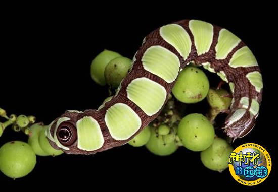 Sphecodina abbottii毛毛虫利用棕色皮肤上的绿色斑点伪装自己,当它趴在正在生长的成串葡萄上时,别人很难发现它。成年Sphecodina abbottii毛虫分化成两种颜色,一种像图上这只毛毛虫的模仿葡萄的伪装色,一种变成像树皮一样的棕色。除此以外,这种毛毛虫还有其他防御手段,例如 假眼。当一只成年Sphecodina abbottii毛虫受到惊扰时,它会翘起尾部,用假眼“瞪着”进攻它的动物。如果这种“瞪视”无法吓跑食肉动物,毛毛虫还会发出刺耳的嘶嘶声。