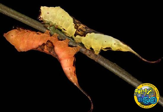 在这张图片中,加菲拍到两只呆在一根黑色樱桃树枝上的Furcula borealis毛虫。与Spicebush凤蝶毛虫相比,这种更接近于化蛹期的毛虫,体表颜色变得更暗,橙色更重,不久后它将寻找一个合适的地方化蛹。