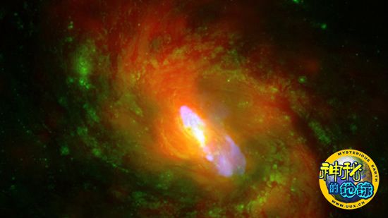 如图,这是NGC 1068星系的合成图片。该星系是距离我们最近、最明亮的星系之一。这张图片显示,该星系内有一个迅速成长的超大质量黑洞。NGC 1068超大质量黑洞异常活跃,可以说是我们已知的最活跃的黑洞之一,不断吞噬大量的NGC 1068星系物质。钱德拉X射线天文台分光仪观测到的X光线图像显示,NGC 1068星系中心以时速100万英里往外喷射炙热气体。