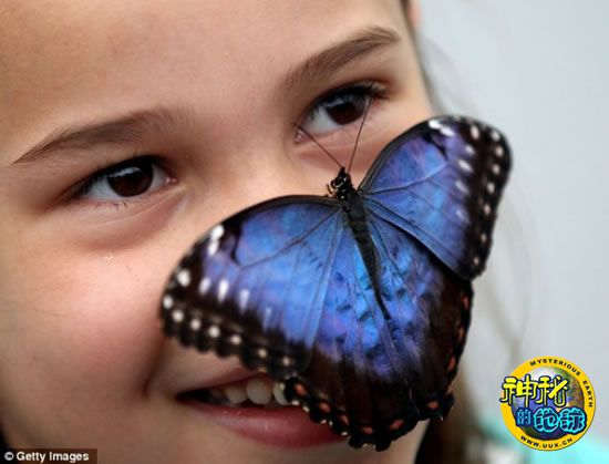8岁的小姑娘露西娅·瓦格斯塔夫和一只蓝色大闪蝶亲密接触。大闪蝶产于南美洲,寿命只有137天。