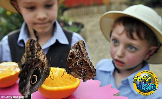 左边的小男孩名叫加布里埃尔·瓦格斯塔夫,右边的小男孩名叫帕克·坎宁,他们正在观察蝴蝶如何享用桔子。成年蝴蝶只有“吸食”能力,而没有“咀嚼”本领。