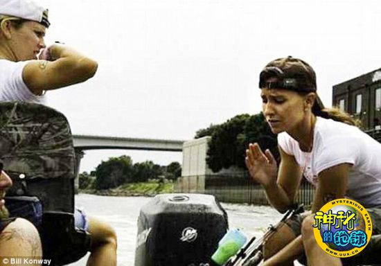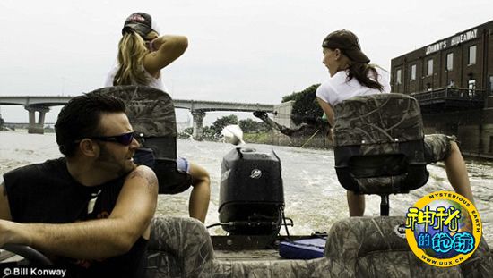 另一名女子正在瞄准,准备射杀跃出伊利诺伊河水面的亚洲鲤鱼