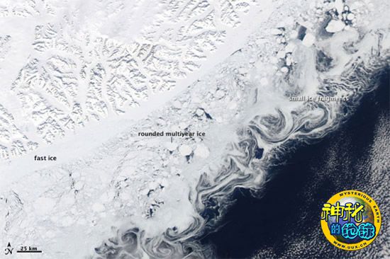 比这些大块的多年海冰更远的则是一些体积较小的海冰碎块。这些碎块体积太小,以至于完全处于洋流的支配之下。大量的小型海冰碎块聚集在一起,在洋流的作用下,形成了一个个精美的冰漩涡。