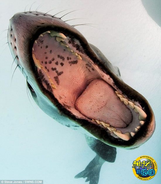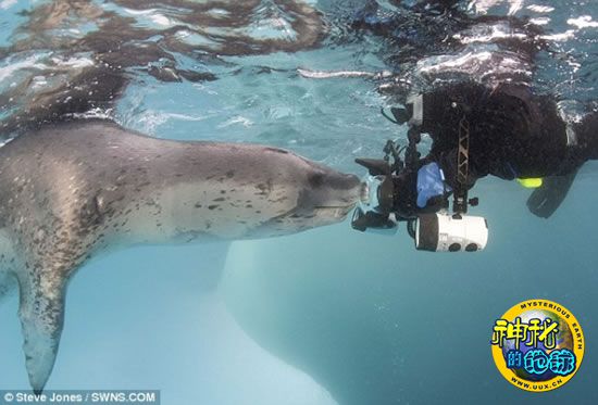 39岁的史蒂夫·琼斯潜到冰层下水温仅为零下一度的水里,抓拍这些爱玩的动物在镜头前翻跟头的画面。令人难以置信的是,海豹竟然游向史蒂夫,用鼻子蹭了蹭照相机镜头,然后快速掉转头,一头扎到深水里去了。有些人专门在食肉动物豹海豹的自然栖息环境下给它们拍照,前潜水教师史蒂夫就是其中一员。