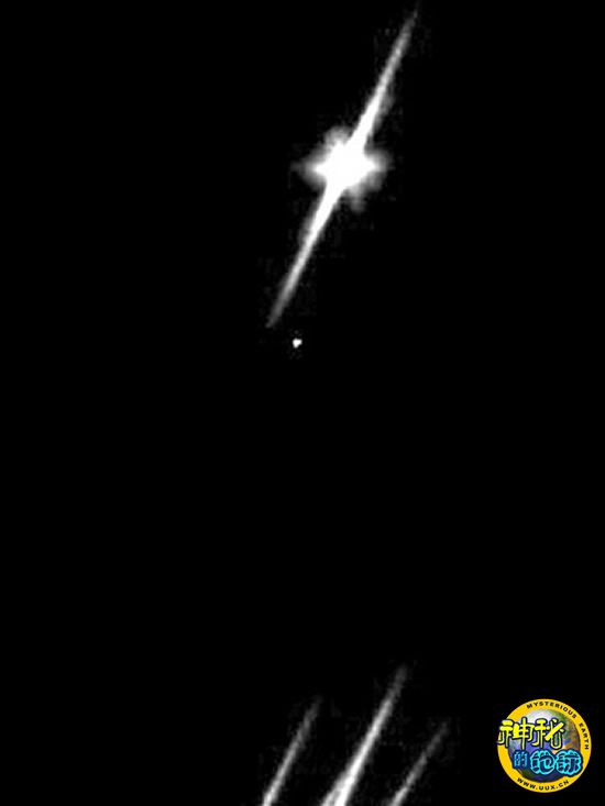 白点为不明飞行物,上方发光体是月亮。