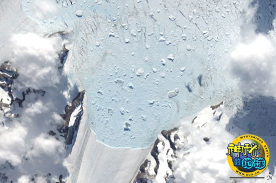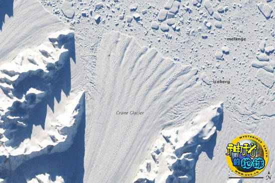 本图拍摄于2003年,图片显示克雷恩冰河出现戏剧性的消退现象。