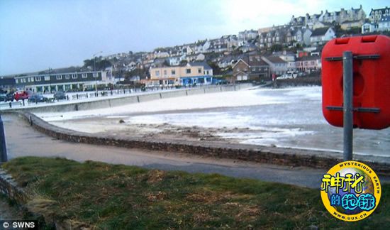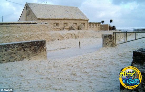 英国康沃尔佩伦波斯的海边度假村一夜之间被覆盖上一层厚厚的白色海浪泡沫,看上去像一幅隆冬的景观。泡沫是涨潮时大风激起海浪飞沫形成的,有的地方泡沫厚度约3英尺(约合0.9米)。