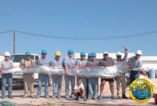 过去令海员们感到胆战心惊的海蛇传说,可能是由这种诡异的皇带鱼引起的。这种动物的名字是根据从它头部一直延伸到尾部的两排像船桨的精美的鳍命名的。然 而至今科学家仍不清楚这些奇怪的“桨”到底有什么作用,专家表示,这些鳍非常轻薄,根本不能帮助它们游动。这张照片中的皇带鱼被搁浅在墨西哥的海滩上,从外观来看,它大约有20英尺(6.10米)长。贝伯勒尔写道,有报道说曾有人见到过55英尺(16.764米)长的皇带鱼,但是这些无法得到证实的报道可能只是谣传。