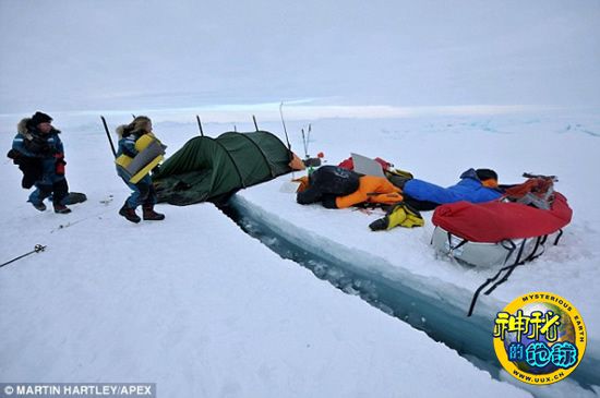 在北极测量考察过程中,英国科学家小组所在帐篷下方的冰层裂开一个大口子。