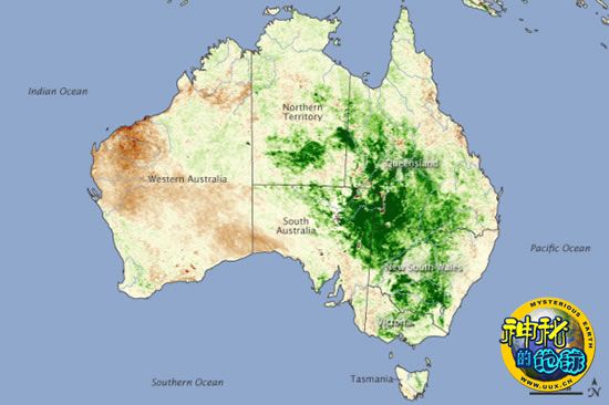 据美国宇航局官网报道,对于澳大利亚中部地区来说,2010年的夏秋之交是一个多事之秋,先是暴雨连连,接着暴雨导致洪灾、虫灾等连锁反应。极端的暴雨不仅仅带来洪水灾害,还同时将干旱、贫瘠的沙漠变成一片绿色。2010年4月,美国宇航局根据“NOAA-18”卫星3月份的观测数据绘制了一幅澳大利亚植被指标图,图片显示了澳大利亚干旱地区植被茂密的极端异常景象,茂密的植被为蝗虫的滋生提供了理想的环境。