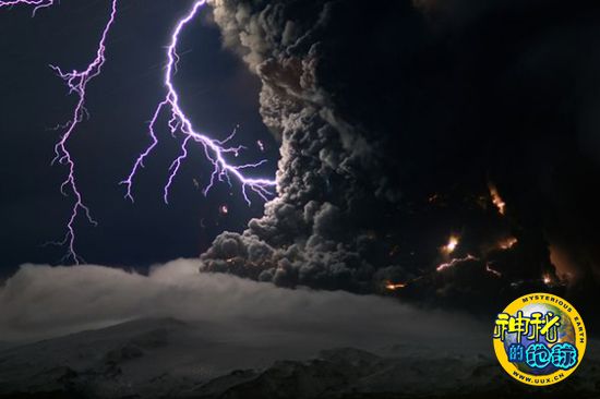 18日日落时分,意大利摄影师兼科学家马克·富勒乘飞机飞越冰岛埃亚菲亚德拉冰盖火山上空,并拍下了这幅紫色闪电划破天际的照片。佛州大学的乌曼表示这座冰岛火山产生的闪电很多可能是长火花,其中可能包括一种最近在阿拉斯加火山上空出现的新型闪电。阿拉斯加火山观测站的史蒂夫·麦克努特2月指出,类似这样的火花如何形成仍旧是一个谜。一种可能性是:带电硅(硅是岩浆中的一种成分)在喷出地壳时与大气发生相互作用所致。