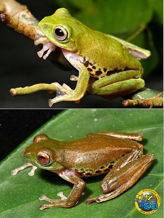 此外还有一种会变色的青蛙,也称为飞天蛙。它们在夜晚的皮肤是绿色的,而白天则变成褐色的,而且眼睛的颜色也随着皮肤颜色改变。